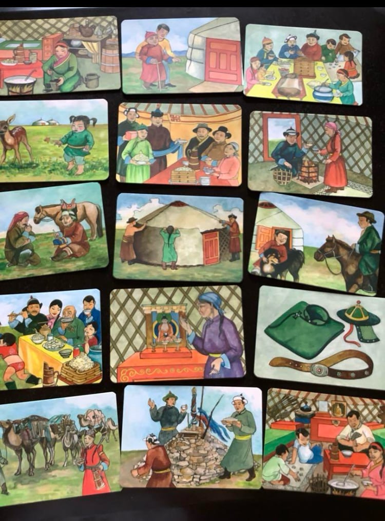 表面はイラスト、裏面はそれについての説明がモンゴル語で書いてあるものです。