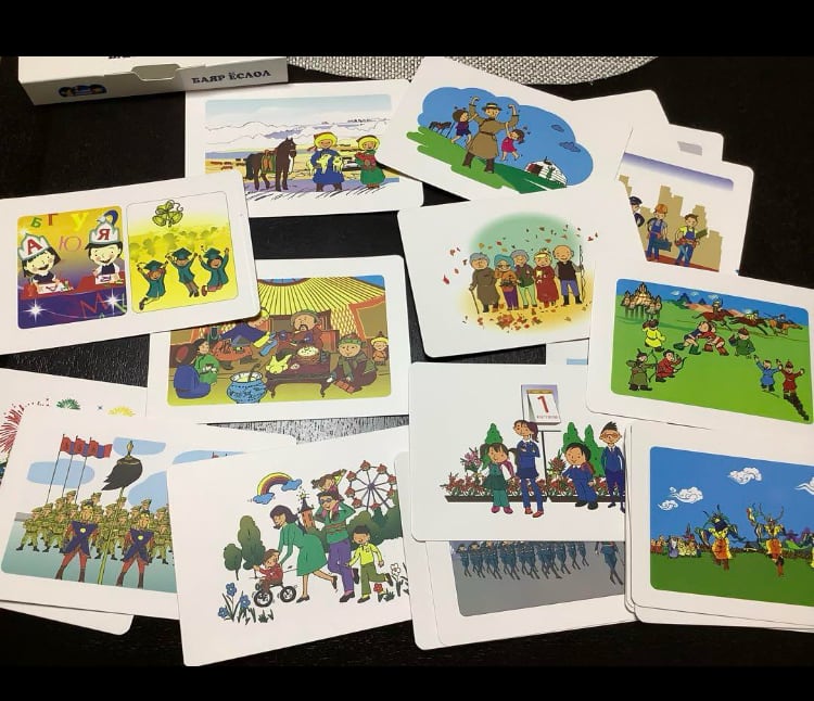表面はイラスト、裏面はそれについての説明がモンゴル語で書いてあるものです。