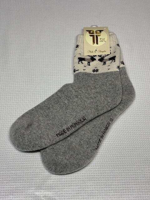 【防寒・あたたかい】 ウール100%靴下 グレー トナカイ柄③ モンゴル国製